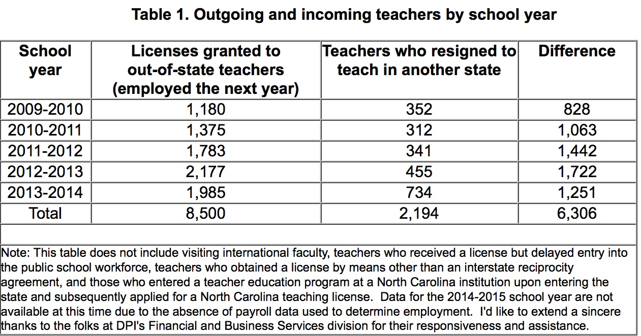 Between 2010 and 2014, 8,500 out-of-state teachers received North Carolina teaching licenses (via interstate reciprocity agreements) and were employed as classroom teachers the following school year. During the same period, around 2,200 teachers abandoned North Carolina to teach in other states. It is not known how many teachers eventually made their way back to the state, but the phenomenon is not unheard of.